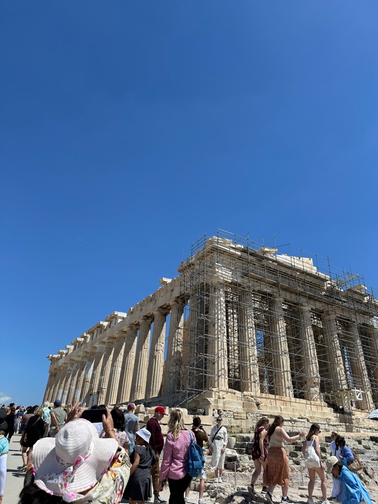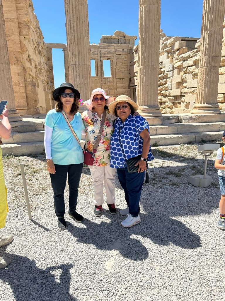 The next stop was the Acropolis Museum which was fascinating as we saw many original pieces from the Parthenon as well as replicas and we understood the details that went into constructing the monument. This museum covers 3 floors and is well worth a visit. We then went t to the rock and climbed up to the Parthenon… beware… there were thousands of people and it is quite a steep and slippery climb. Anu didn’t want you to take a chance and stayed in a cafe at the base and played bridge on her phone!!! We were lucky because although the sun was extremely bright there was a lovely breeze so it wasn’t too uncomfortable… a lot of screams could be heard where their hats flew off so we all held onto our hats with dear life!!! The view from the top was amazing… you could see the whole of the city. The Parthenon is magestic though somewhat spoilt by all the scaffolding and cranes dotted around for reconstruction and maintenance work. There are lots of side temples which our guide pointed out to us.