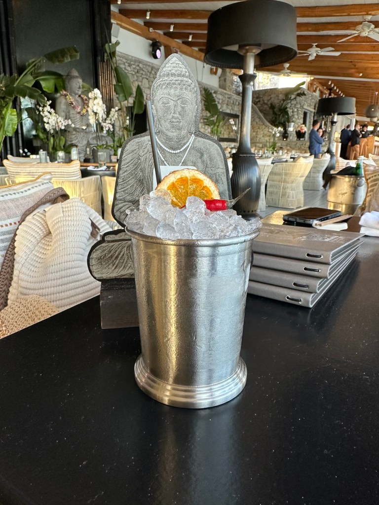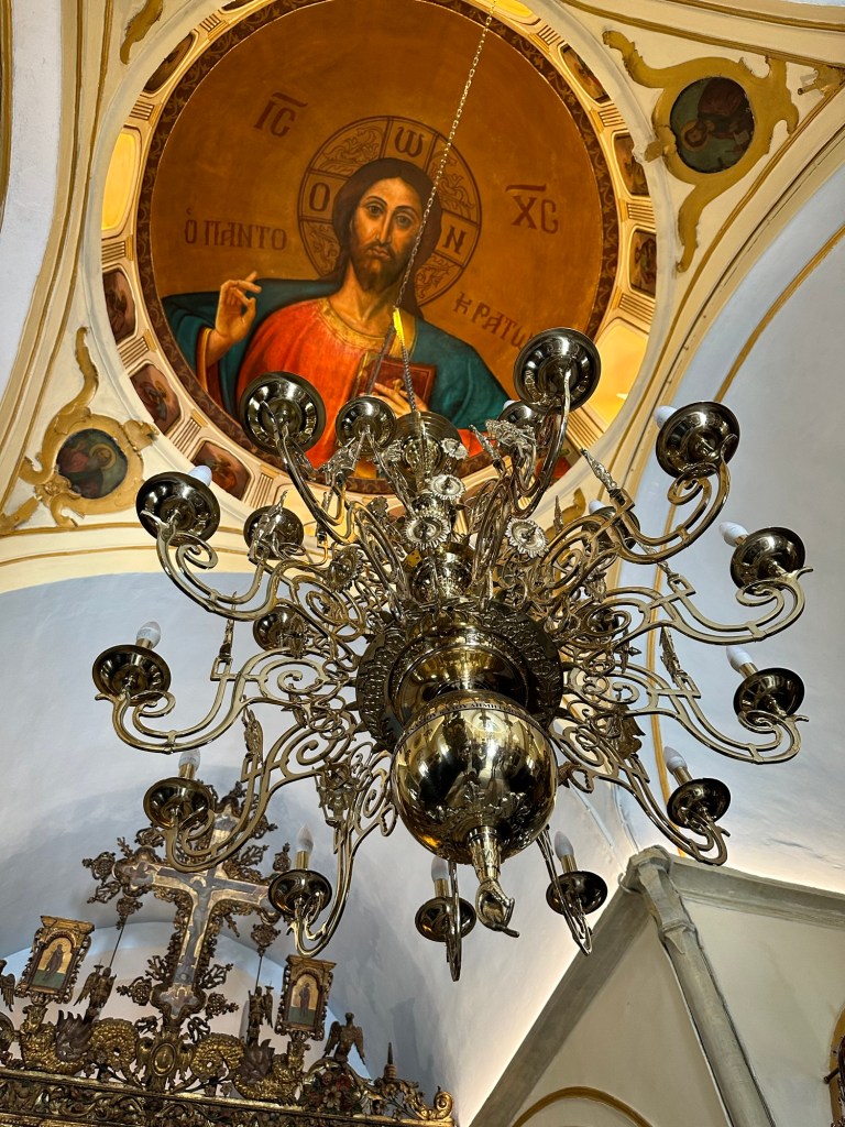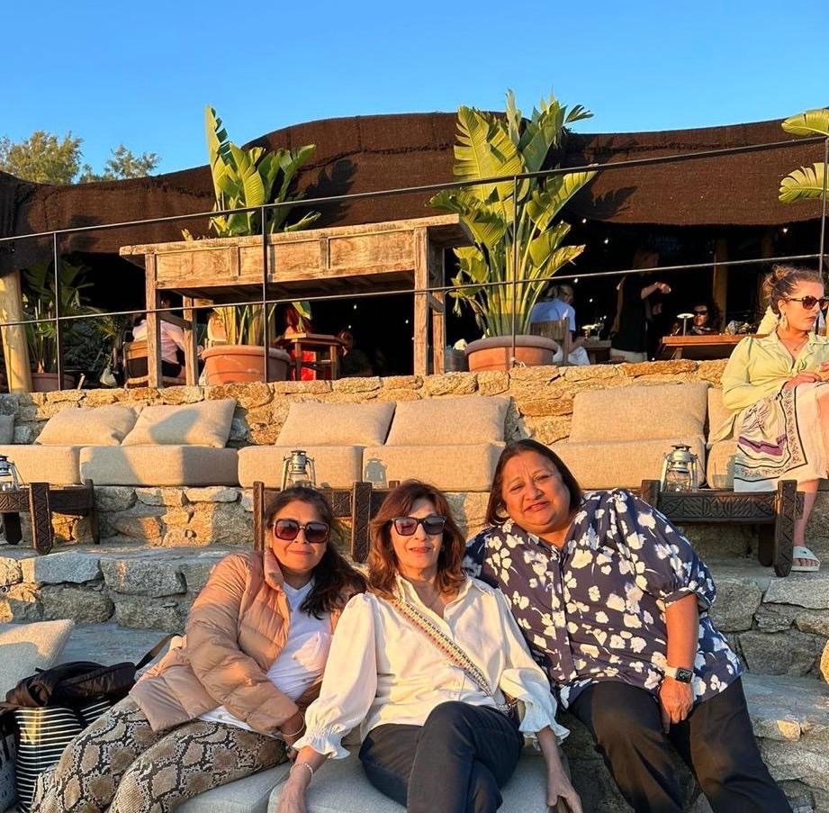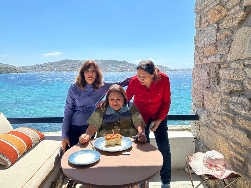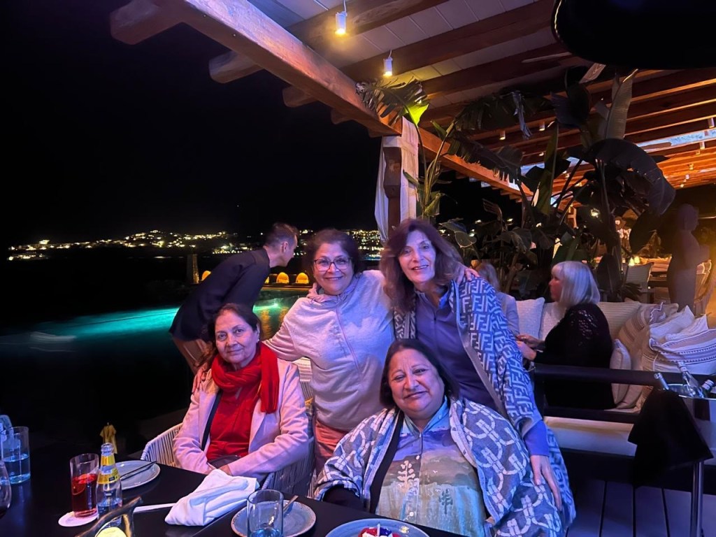 The next day was my big day…. My 66th Birthday !!! I was as excited as a kid when I woke up to forty messages and numerous phone calls and my besties pampered me royally. We spent a lazy morning and afternoon by the swimming pool drinking Prosecco and then went on a tour of the island. We visited a little town called Ana Mera and saw a beautiful church with lovely inlaid work. We also saw the famous Mykonos Windmills and took the obligatory photos with them. Then we drove round the island visiting various beaches and went for dinner to Budha Bar which was lovely especially after they lent us shawls and put on the large heaters next to the table. We were all starving as we had been on liquid diets since breakfast so the lovely Asian food and cocktails went down very smoothly.