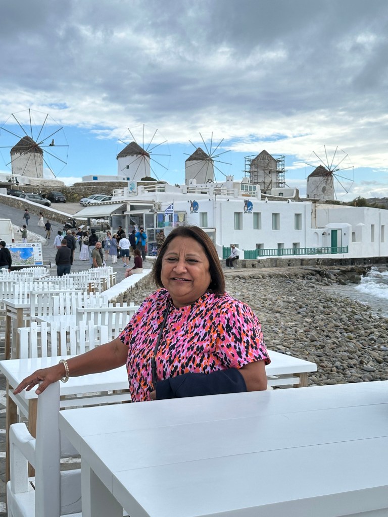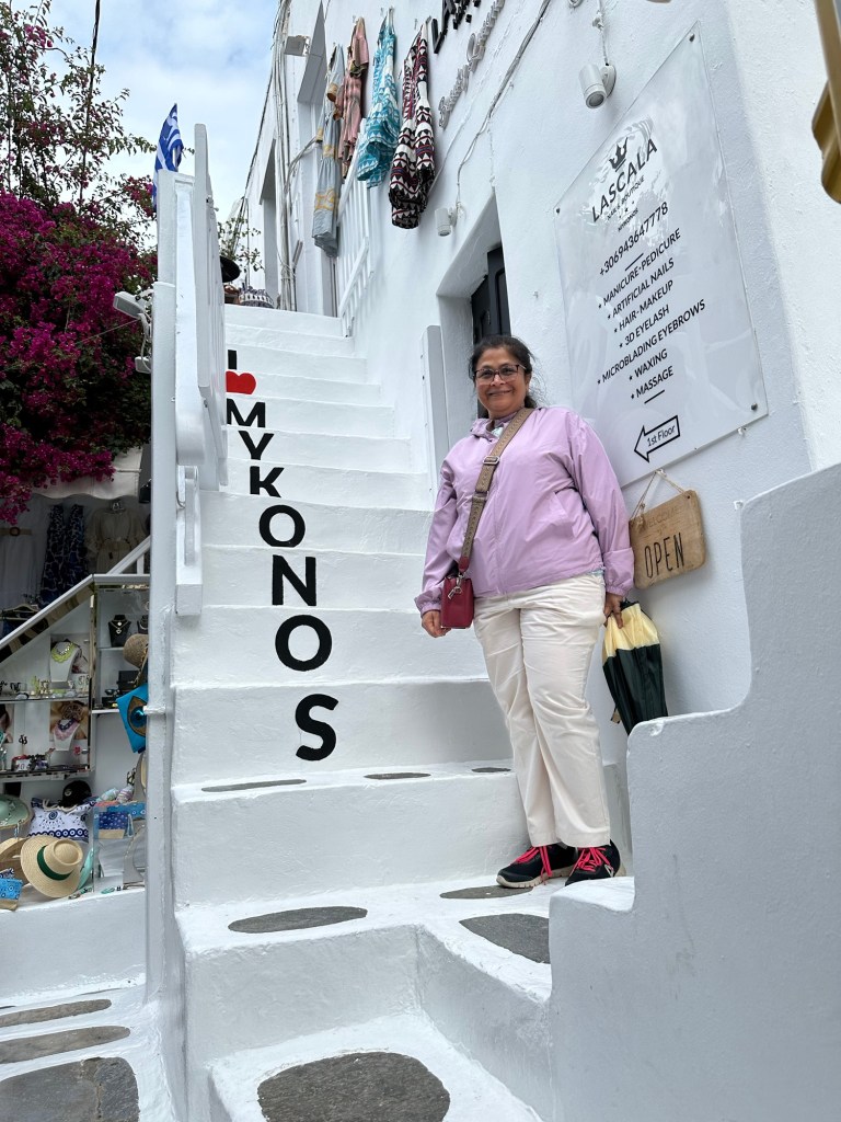 We reached Mykonos after a rather harrowing ferry journey mainly due to the fact that I can’t travel light… well no let me rephrase that… I don’t like to load up a suitcase too heavily so I prefer to carry 2 smaller suitcases rather than one huge one. Which is fine when there are porters around to assist you but very stressful when you have to climb steps onto the ferry amongst hundreds of other passengers. However … we managed ( would you expect anything less?) and found our seats. We have worked out a strategy for our next ferry journey so let’s see if it works!!! So we reached Mykonos and it is beautiful…. Clear skies, blue blue sea but windy as hell!!! I had to buy a warm jacket to counter the cold. The town is lovely and quaint with cobblestones and narrow lanes almost like a maze. On the first day Monisha and I wandered round the town for nearly 3 hours despite the slight drizzle and at one point we realised we were just going round in circles… how much we laughed!!! We passed one restaurant which we thought we would come back to for dinner but we just couldn’t find it so we had to change plans.