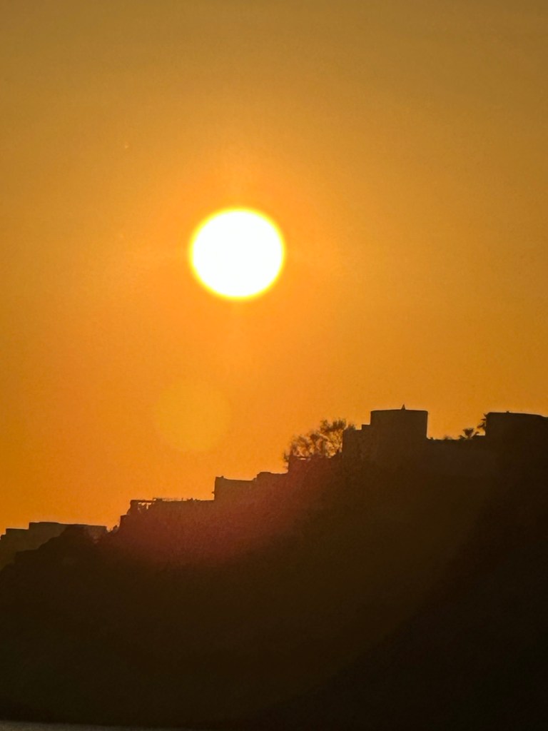 The next day we all bought some lovely Greek linen shirts and wandered around the shops and then went to Paradise Beach Club where we spent the afternoon. We all felt a little out of place amongst the young scantily clad girls but still had fun just sitting on the beach watching the world go by. From there we went to a fantastic place which is a beach bar/ restaurant and night club on the side of a hill overlooking the sea. We watched the beautiful sunset and saw the colours change from yellow to pink to blue… it was a sight to behold. This was a real happening place with hundreds of people enjoying their drinks and dancing. One felt young here!!!