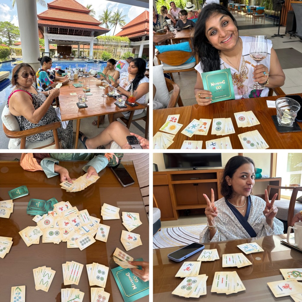Normally when Vinay and I go on these beach holidays we take our boggle, scrabble and cards and play these whilst sitting by the pool and it’s a great way to pass one’s time. This time I took them but we never played as the time would just fly by whilst we laughed and joked around. Since Neha and I have both become rather addicted to Mahjong I heard about the card version of this game and immediately ordered it on Amazon. This is called Mahjong Go and is much easier to carry on a trip than lugging the tiles, mats and racks and it was great fun. We even taught Rashi and Aradhana the basics and they also enjoyed it especially when they both made mahjong’s!!!